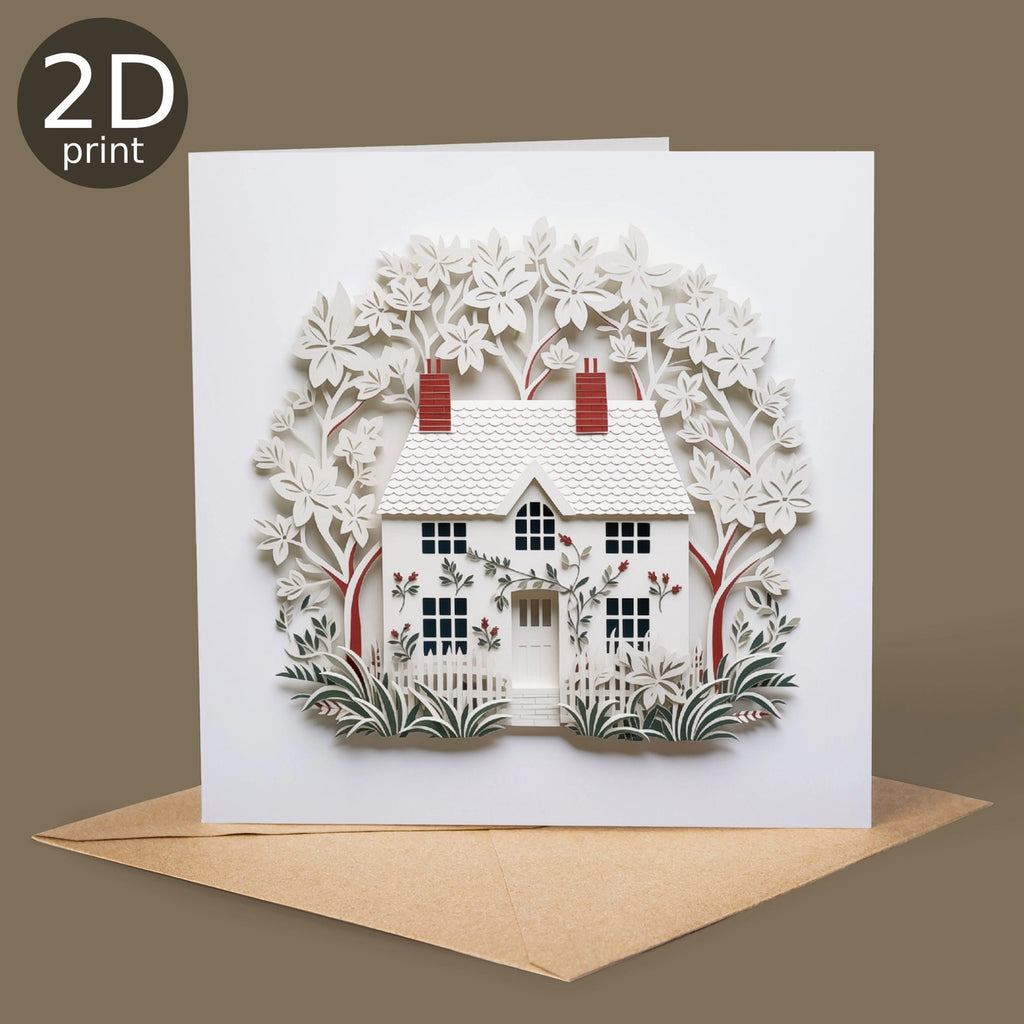 A charming card featuring a cozy ivy-clad cottage, printed with a clever 3D-style effect that looks beautifully dimensional — but is actually a flat 2D design! Perfect for sending a little piece of countryside charm.