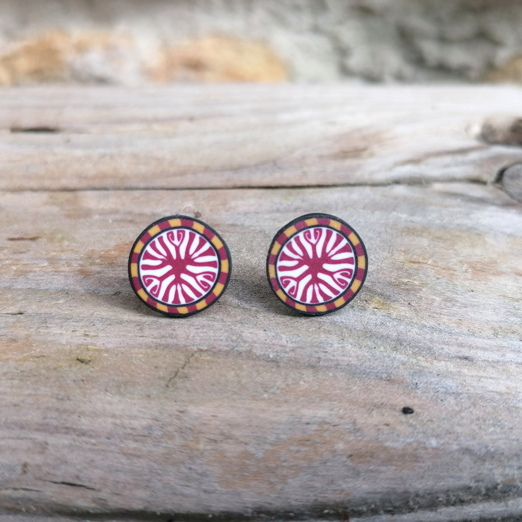 This unique design showcases a burgundy red and white kaleidoscope with a mustard yellow and burgundy striped border. The cane is reminiscent of celtic design. Finished with hypoallergenic stainless steel posts and butterfly backs, these earrings are lightweight, comfortable, and perfect for sensitive ears.