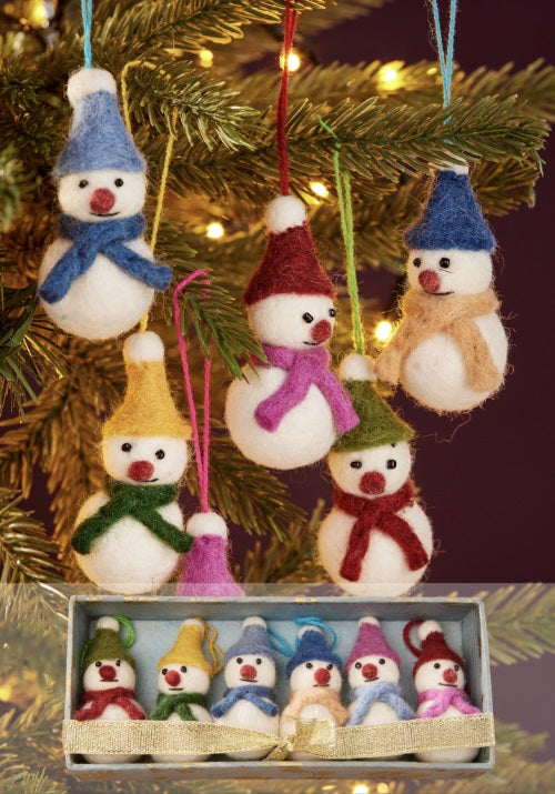 A heart-warming collection of six handcrafted felt snowmen, each dressed in a colourful hat and scarf and beautifully presented in a recycled gift box wrapped with ribbon. Made from sustainable wool felt, these charming characters bring a touch of festive magic to any home.