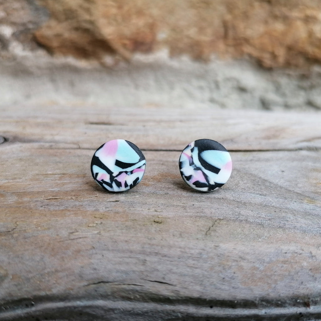 Handmade by Emily Jane Adam of Supremily Jewellery, these pastel circle-shaped stud earrings are joyful little bursts of colour and creativity. Each pair is uniquely crafted from the scrap ends of hand-sculpted Fimo Professional polymer clay canes, using a traditional technique where clay is blended, rolled, and sliced to reveal one-of-a-kind patterns.