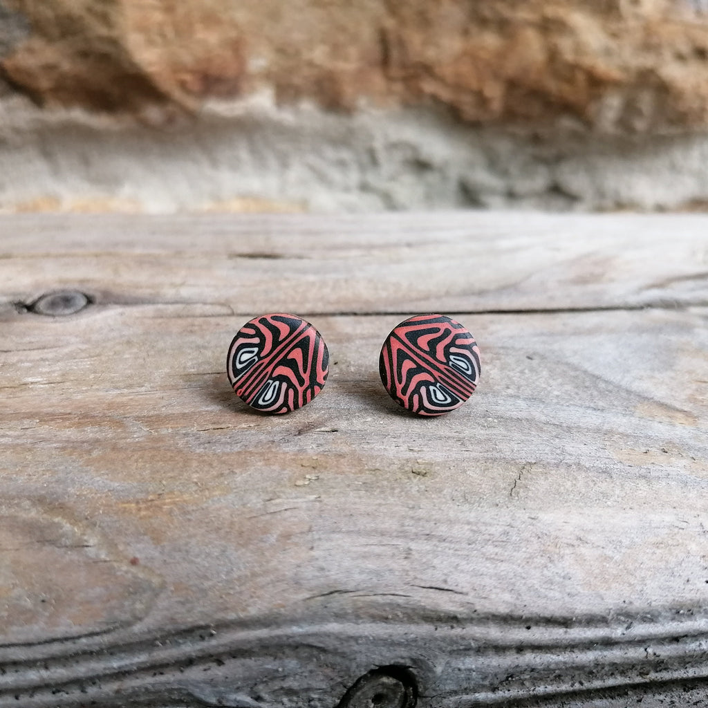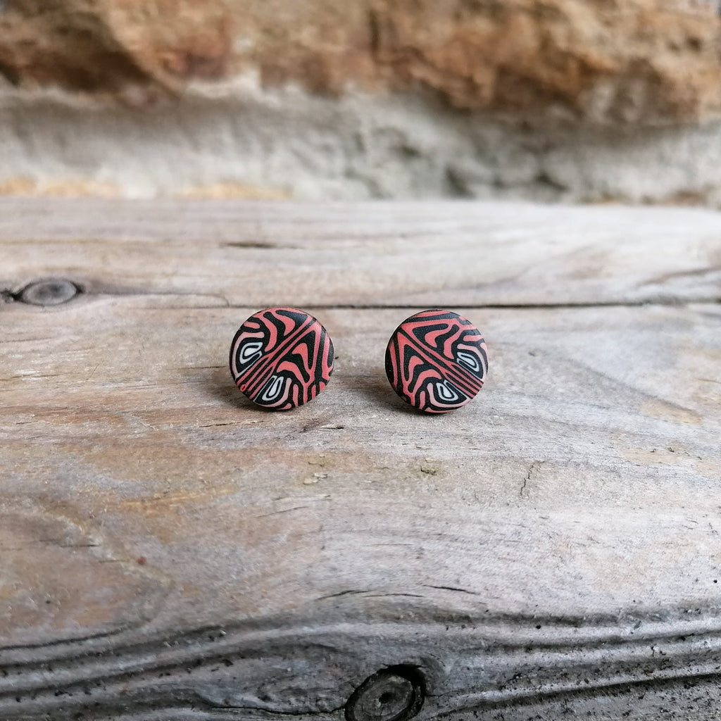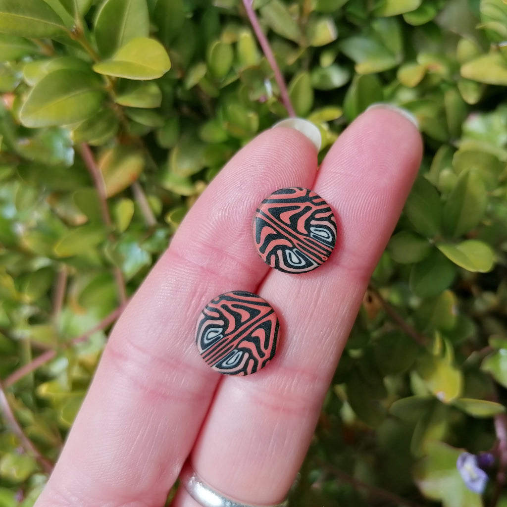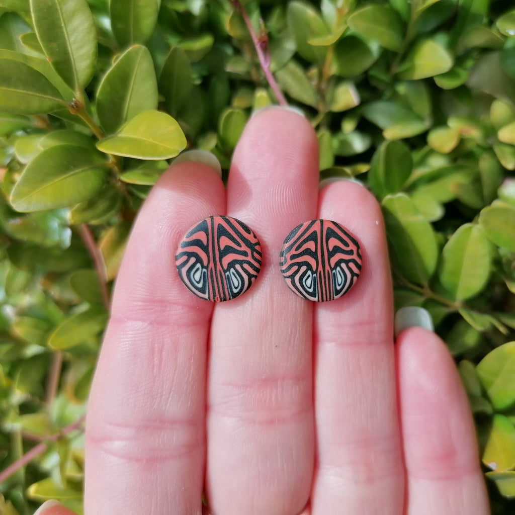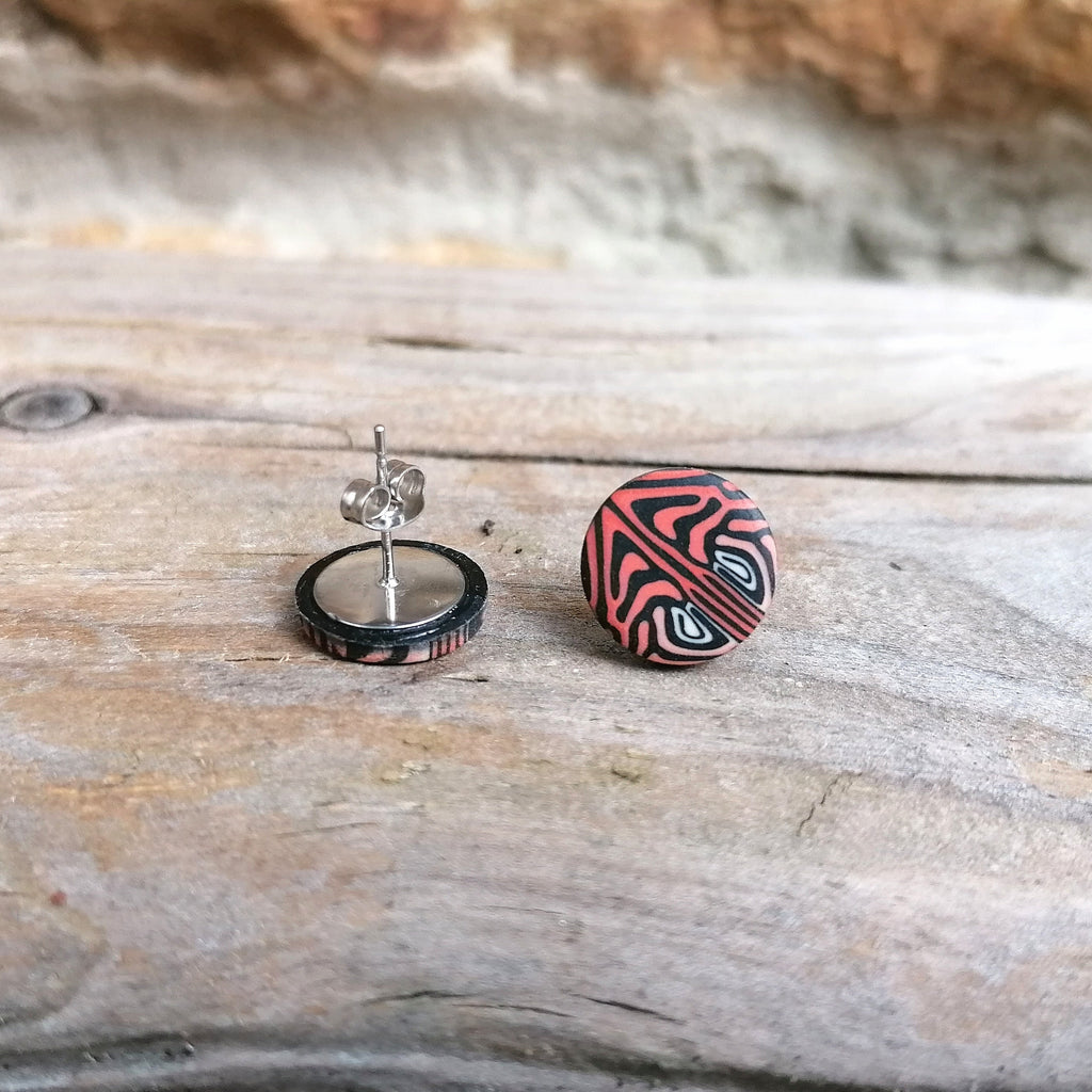 Handmade by Emily Jane Adam of Supremily Jewellery, these tiger style circle-shaped stud earrings are joyful little bursts of colour and creativity. Each pair is uniquely crafted from a hand-sculpted Fimo Professional polymer clay cane, using a traditional technique where clay is blended, rolled, and sliced to reveal one-of-a-kind patterns.