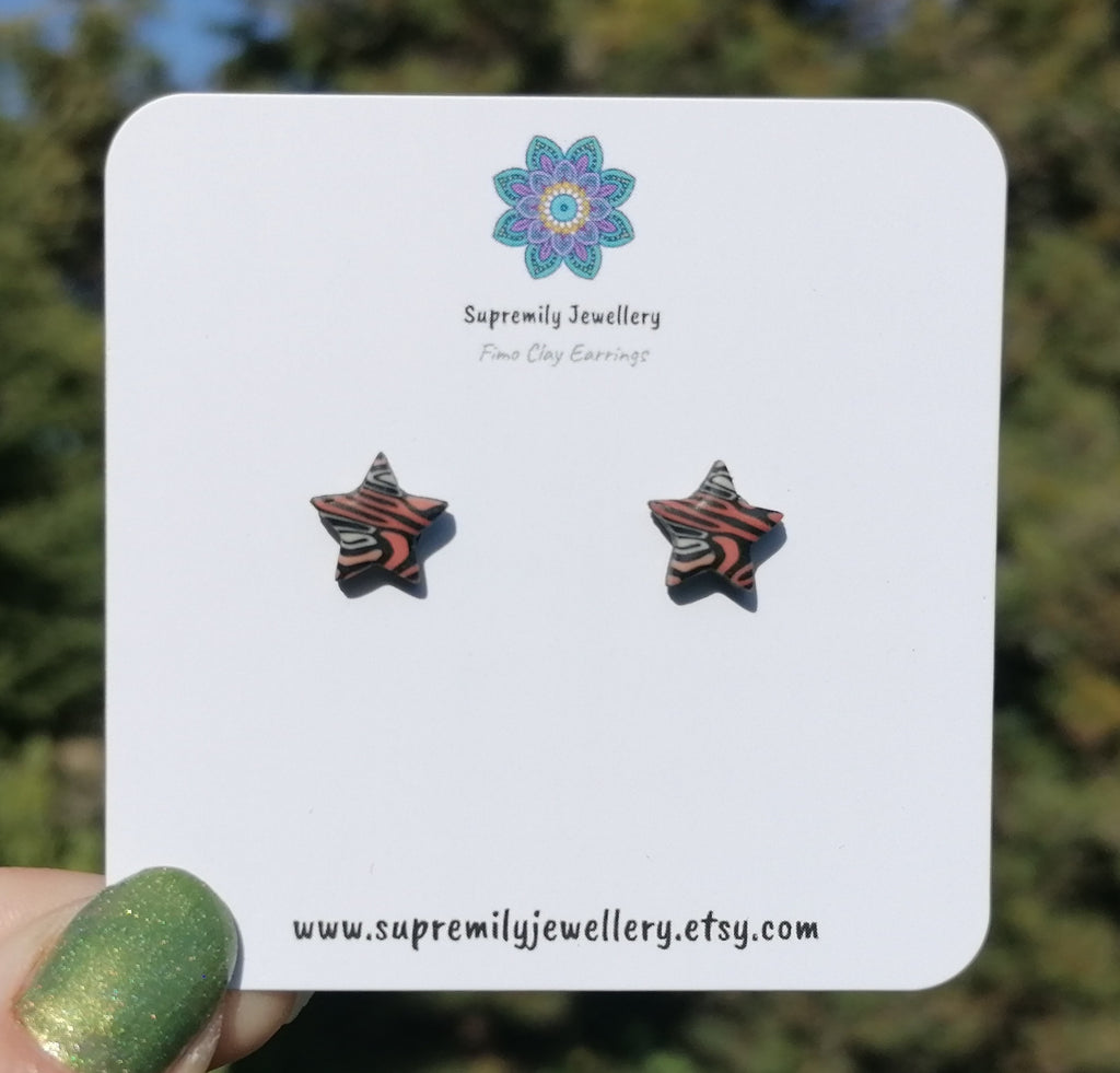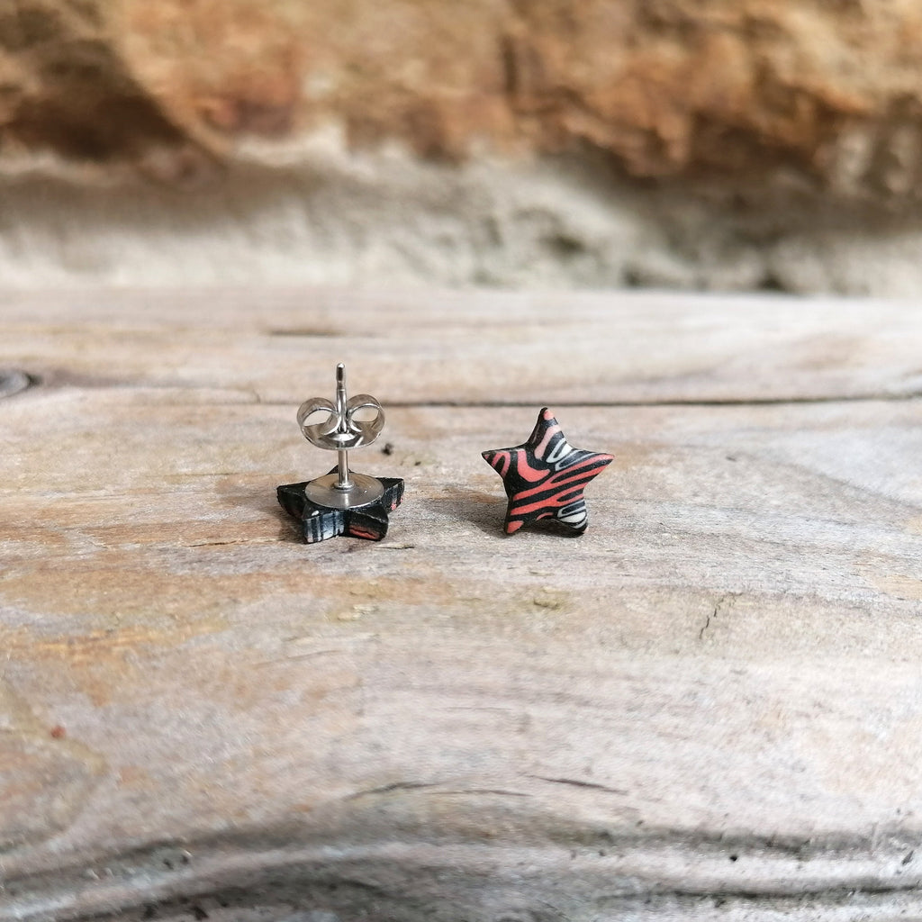 Handmade by Emily Jane Adam of Supremily Jewellery, these little star-shaped stud earrings are intricate little bursts of colour and creativity. Each pair is uniquely crafted from a hand-sculpted Fimo Professional polymer clay cane, using a traditional technique where clay is blended, rolled, and sliced to reveal one-of-a-kind patterns.